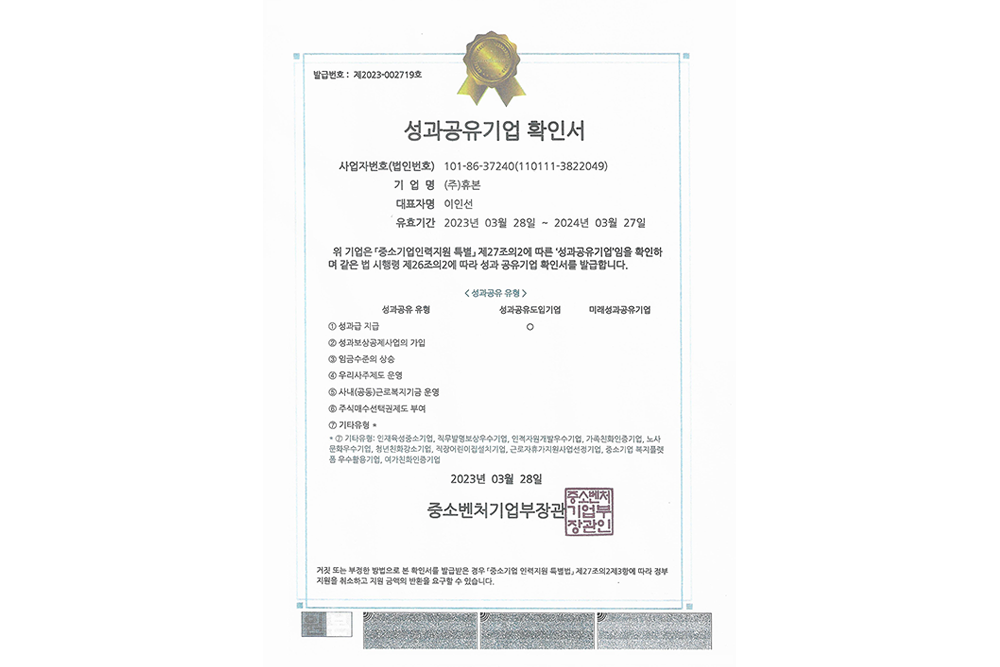 (ÁÖ)ÈÞº»Àº ±Ù·ÎÀÚ¿Í ¼º°ú¸¦ °øÀ¯Çϰí Àְųª °øÀ¯Çϱâ·Î ¾àÁ¤ÇÑÁß¼Ò±â¾÷¿¡°Ô ÁÖ¾îÁö´Â ¼º°ú°øÀ¯±â¾÷À¸·Î ÀÎÁ¤ ¹Þ¾Ò½À´Ï´Ù.