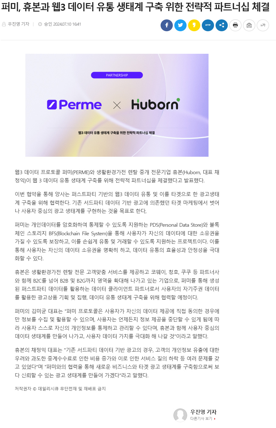À¥3 µ¥ÀÌÅÍ ÇÁ·ÎÅäÄÝ ÆÛ¹Ì(PERME)¿Í »ýȰȯ°æ°¡Àü ·»Å» Áß°³ Àü¹®±â¾÷ ÈÞº»(Huborn, ´ëÇ¥ äÁ¤ÀÍ)ÀÌ